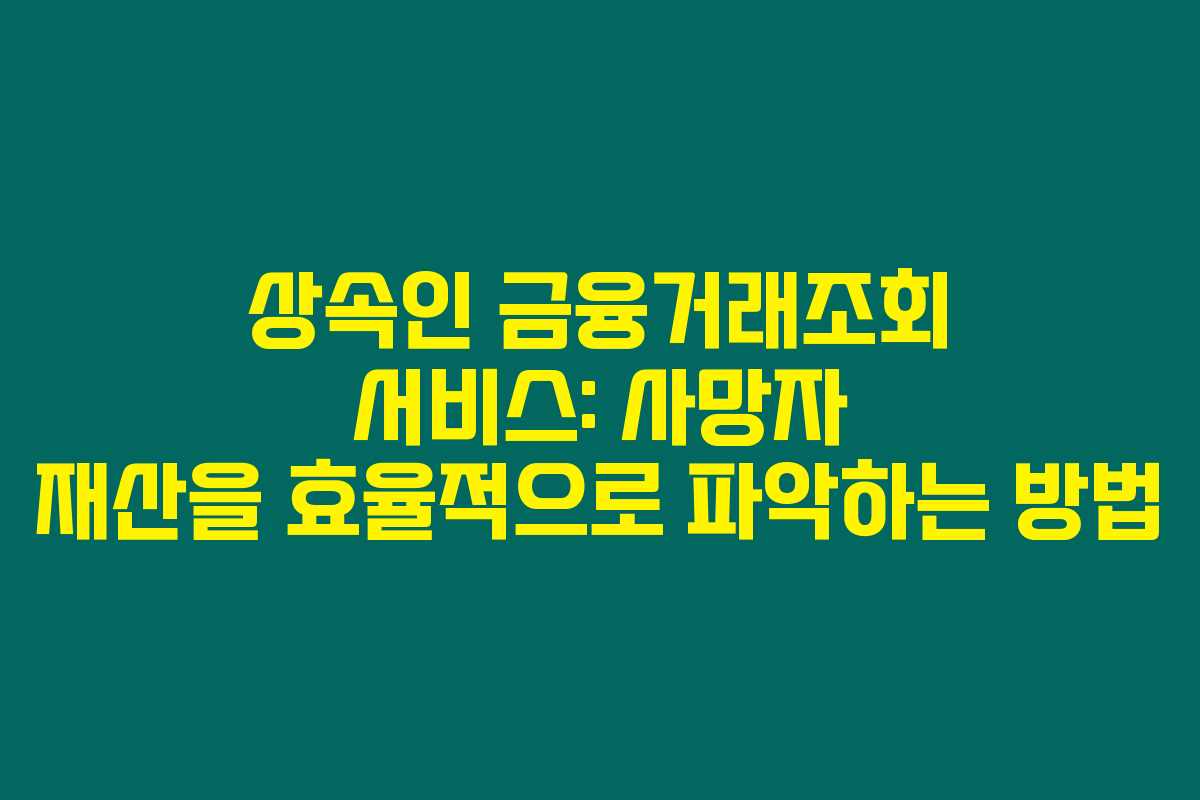 상속인 금융거래조회 서비스는 사망자가 남긴 금융 거래 내역을 확인할 수 있는 중요한 서비스입니다. 제가 직접 리서치한 바로는, 이 서비스를 통해 상속인들은 사망자의 금융 재산을 정확하게 파악할 수 있어, 상속 재산 관리에 많은 도움을 받을 수 있답니다. 이 서비스는 상속인뿐만 아니라 성년후견인, 한정후견인, 상속재산관리인 등 다양한 이해관계자에게도 제공됩니다.