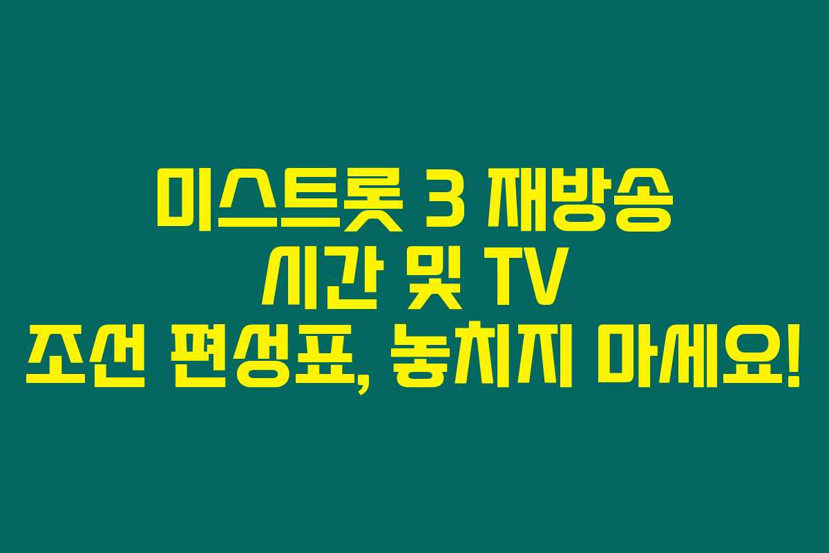 미스트롯 3를 놓친 분들에게 귀한 정보가 담긴 포스트입니다. 미스트롯 3 재방송 시간을 알고 싶다면 아래를 확인해 보세요! 각각의 회차에 대한 시청 팁과 편성표도 함께 소개하니, 팬이라면 반드시 체크해야 할 시간이랍니다.