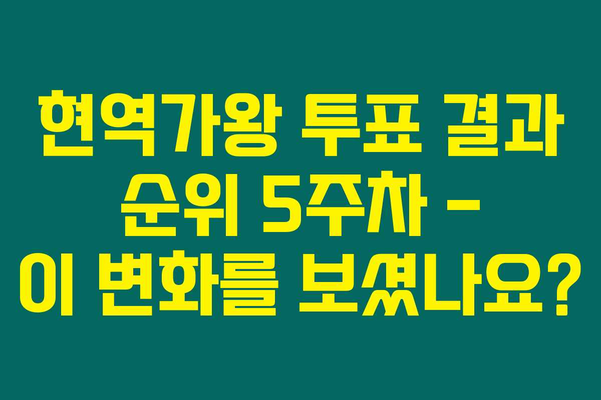 이번 현역가왕 5주차 투표 결과가 공개되었습니다. 이 결과는 단순한 숫자 이상의 의미를 가지고 있습니다. 만약 당신이 현역가왕에 대한 열렬한 팬이거나, 이 중에서 어떤 참가자를 응원하고 있다면 아마도 결과를 발표하는 순간이 손에 땀을 쥐게 하는 그런 순간이었을 겁니다. 아래를 읽어보시면, 5주차 투표 결과와 함께 순위 변동의 의미를 더욱 깊이 이해할 수 있습니다.