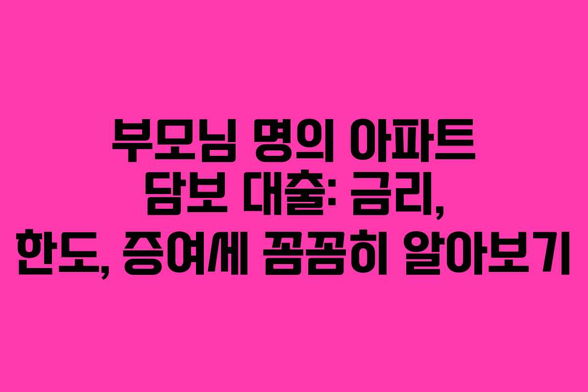 부모님 명의의 아파트를 담보로 대출을 받는 것은 자녀가 필요한 자금을 신속하게 마련하는 좋은 방법이지만, 법적 및 세무적 유의사항을 잘 숙지하고 신중하게 접근해야 합니다. 추가적인 정보나 상담이 필요하다면 금융 전문가의 도움을 받는 것도 좋은 방법입니다.