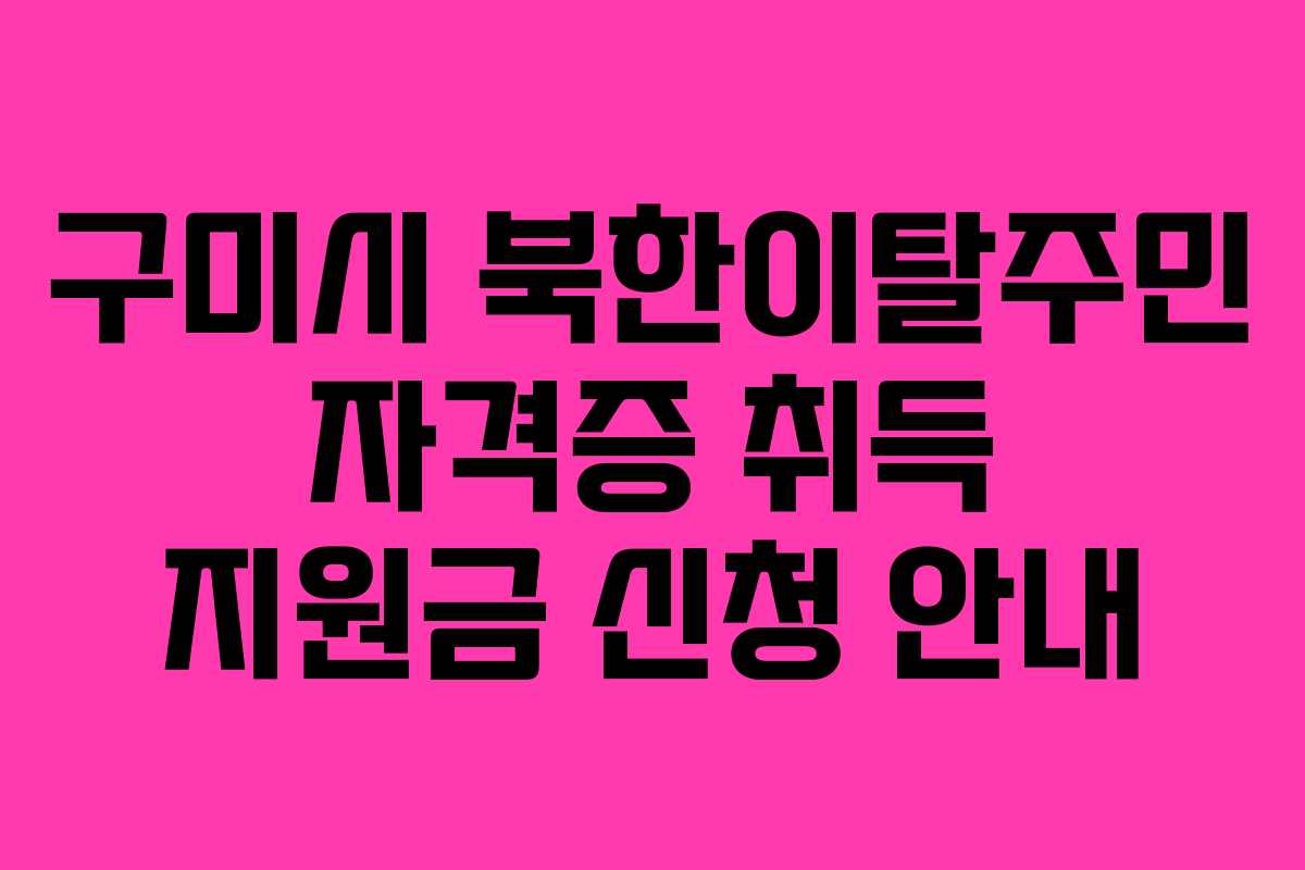 구미시에서 거주하는 북한이탈주민을 위한 자격증 취득 지원금 신청 안내입니다. 자격증 취득을 통해 경제적 자립을 이루고자 하는 분들에게 최대 50만원의 지원금을 제공합니다. 이 기회를 통해 여러분의 꿈에 한 발짝 더 다가가세요!